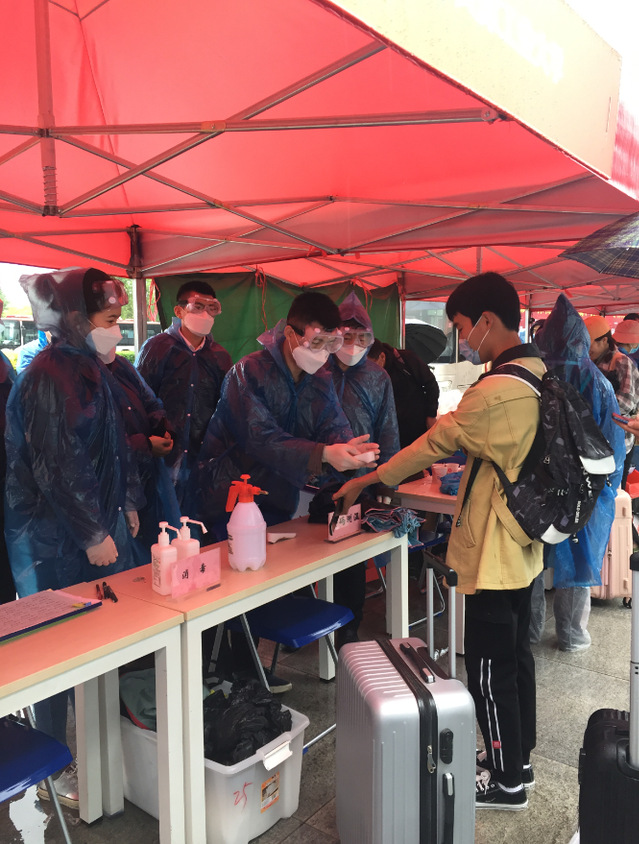 5月8日毕业生返校当天,学院教师党员突击队及辅导员共30余人参加学校“三站一场”接站工作,不惧风雨顺利完成学生身份核验、行李消杀、扫码测温、情绪安抚等各项任务;学院党委副书记方桂珍,副院长王赜、李静东和相关辅导员在公寓楼迎接返校学生,确保学生按照疫情防控要求有序入住;学院院长汪剑鸣深入宿舍与学生谈心谈话,欢迎学生返校回家,并嘱咐学生加强防护,努力学习。学院同时在学生公寓区和学院办公区入口大厅分别安排辅导员和教师党员实行常态化值班值守。