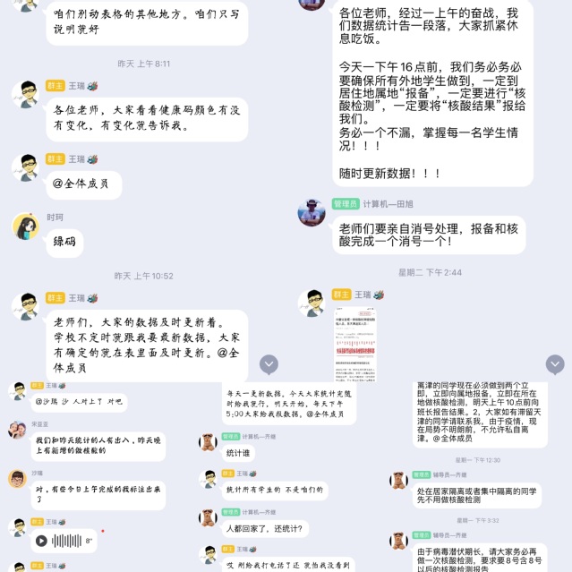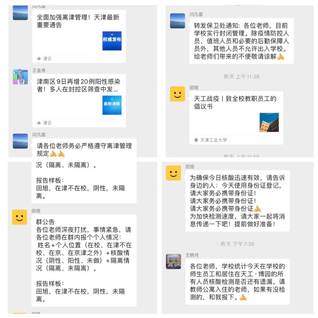 学院综合管理办公室王明月老师每天统计学院76名教师健康监测情况,并及时发布相关学院疫情防控工作提醒。学工办辅导员们24小时在岗,严格贯彻落实学校疫情防控相关部署,每日多次统计学院在津和离津的1522名学生的健康情况,向社区报备情况和核酸检测情况,关心学生的身心健康,随时传达学校已经防控工作相关通知精神,耐性解答学生问题。