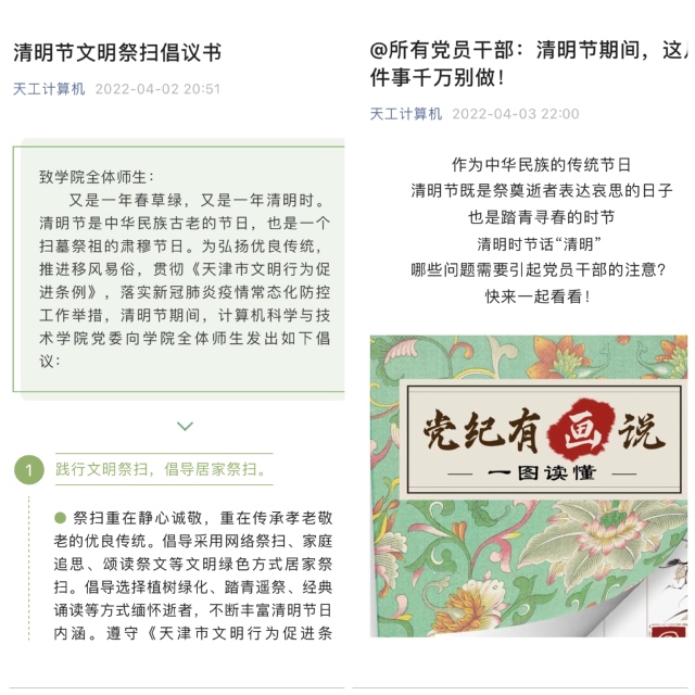 学院通过微信公众号推出了《清明节文明祭扫倡议书》,推送了《@所有党员干部:清明节期间,这件事千万别做》,号召全院师生共同携手,党员遵纪守法,做好示范带头,落实疫情防控要求,争做文明祭扫的践行者、移风易俗的推进者、文明殡葬的先行者、安全有序的维护者。