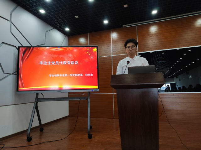 纸短情长砥砺前行学生物联专业第一党支部毕业生党员白文龙作代表发言,深情表达了对学校、学院四年多精心培养的感激之情和对学院不断蓬勃发展的真挚祝福,并表示今后一定坚定理想信念,站稳人民立场,练就过硬本领,投身强国伟业,在实现中华民族伟大复兴中国梦的新长征路上奋勇搏击!